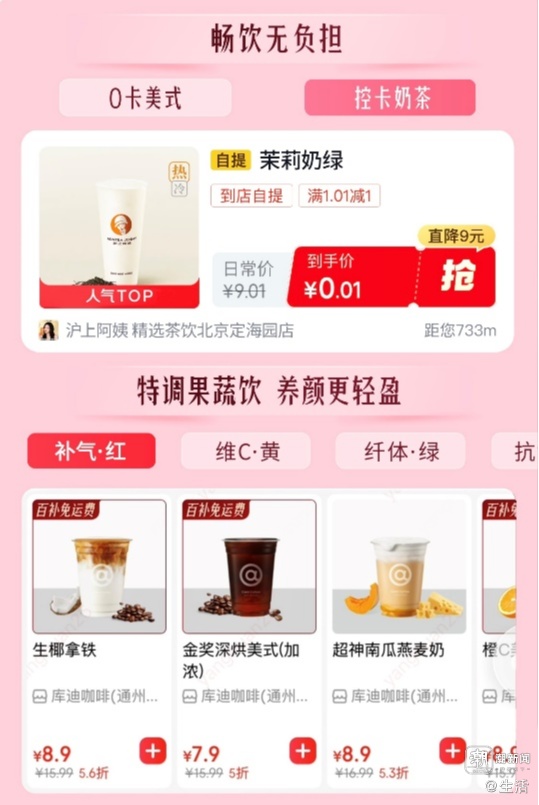在服务上,京东不仅提供“一杯即送”外卖送到家服务,也提供“自提更省”的体验,购买双杯饮品到店自提还可再减一元,让闺蜜小聚的雅瞻念加倍。